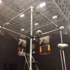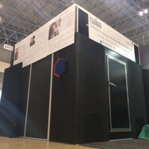 今回の展示をご紹介させていただきます。音響用ではSHIZUKA Stillness Panelがありますが、こちらはアルミ製で重量・コストとも主にプロオーディオユーザー向けでした。今回の展示会ではより軽量で持ち運びに適し、コストも抑えた試作吸音パネルを展示させていただきました。展示会場では女性の方に試作パネルを持っていただきましたが、皆様から「軽い!」という言葉をいただけました。