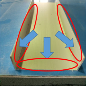 矢印の部分にはパネルが入ります。コーキング材は下記の画像の箇所に入れることをおすすめしており、吸音面側の角・端部分には多めに使用した方がしっかりと固定されます。弊社では枠材を斜めにカットできるため45度に切り、角で2本合わせることで90度の四角いパネルを作っています。