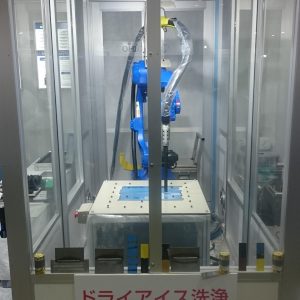 画像の中心部に見えるのがドライアイス洗浄機で、それを覆っている箱型の防音ボックスに弊社の防音パネル「一人静タイプA」が使用されております。