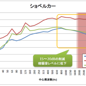 グラフのように広範囲で15~20dBの騒音低減が見られます。体感でいうと1/2から1/4の効果が得られ、とても効果的であるとの結果となりました。