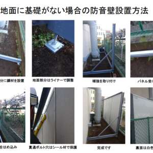 基礎コンクリートが無い場合の防音壁設置方法ですが、今回のように騒音対象物架台に支柱を取り付ける方法が有効です。例えば地面が土が土砂の場合もこのような形での設置が可能です。施工時間も男性2名にて鋼材の墨出を行い取り付け、完成まで4時間ほどで完了いたします。(防音壁の長さや仕様により異なります)基礎コンクリートが無く防音壁の設置を断念している方は、是非弊社へお任せ下さいませ。