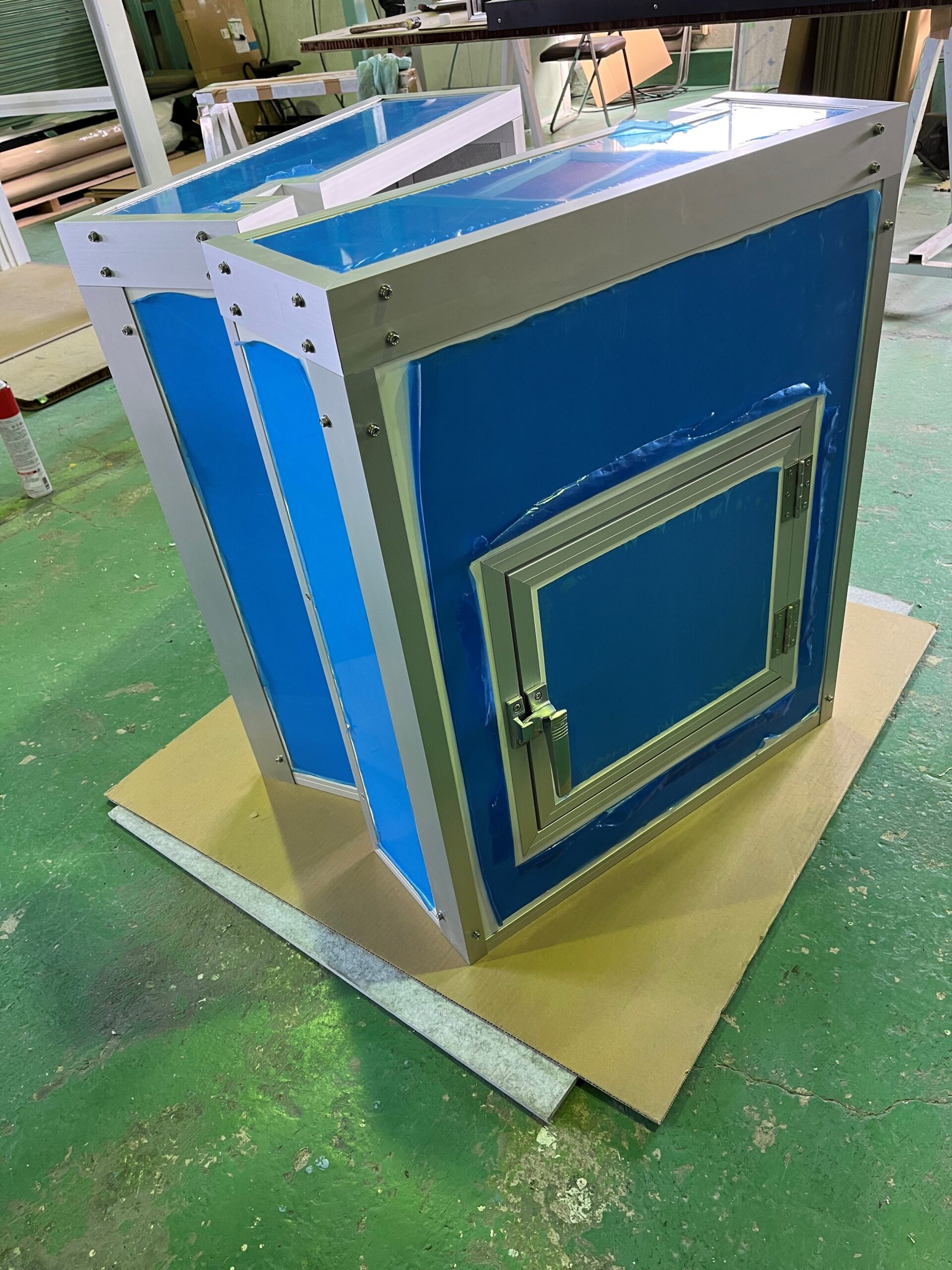 お客様のご要望に合わせて、防音カバーの製作を行いました。BOX装置の操作盤を操作できるようにするために、丁番と取っ手を取り付けた片開式の扉を設置しました。扉の加工に関しては、お客様のご希望により片開式や両開き式、スライド式など、様々なタイプの加工をお受けしています。