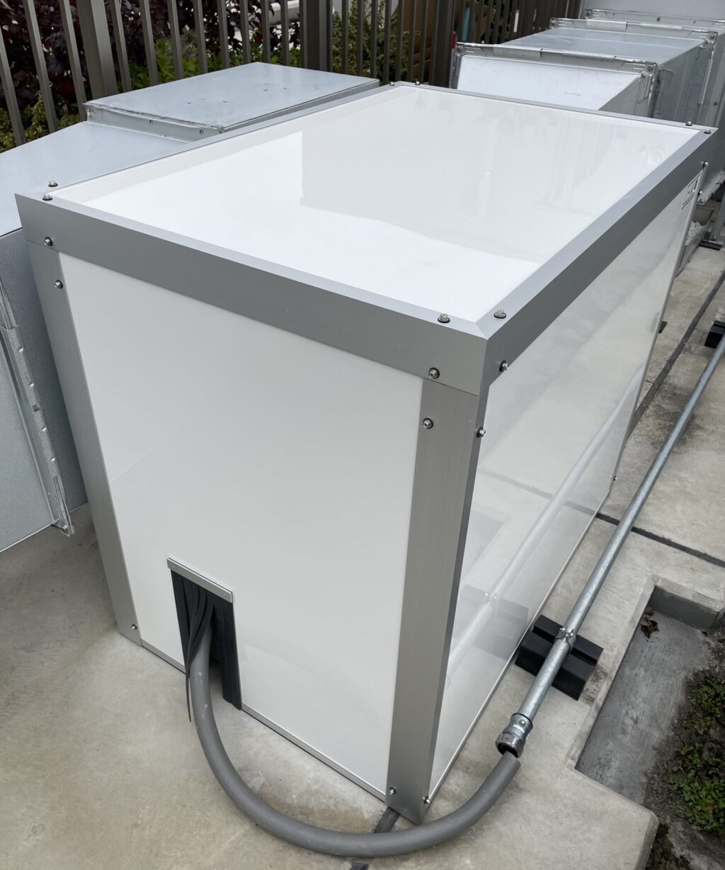 本案件における、防音カバーの特徴としては、既設の金具、配管の調整必要がなく設置可能な設計となります。