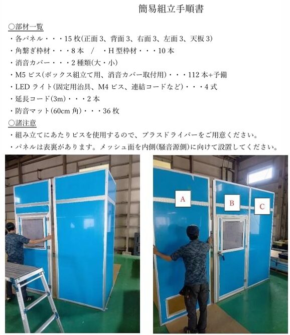 防音室はパネルを組み合わせて設置する構造のため、分かりやすいように写真を添付した組立手順書を用意し、納品時に併せてお渡ししました。手順書には以下の内容を記載しました。
