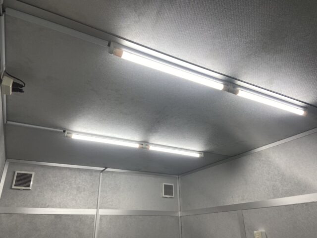 快適さを求めるためにLED、エアコンや換気扇も完備されており、長時間の作業にも支障がありません。広さもそれなりにあるため、机などを置くことで加工をしない時は事務室としての使用。室内にいると外部の音も緩和されるので、集中できる個室のような使い方
