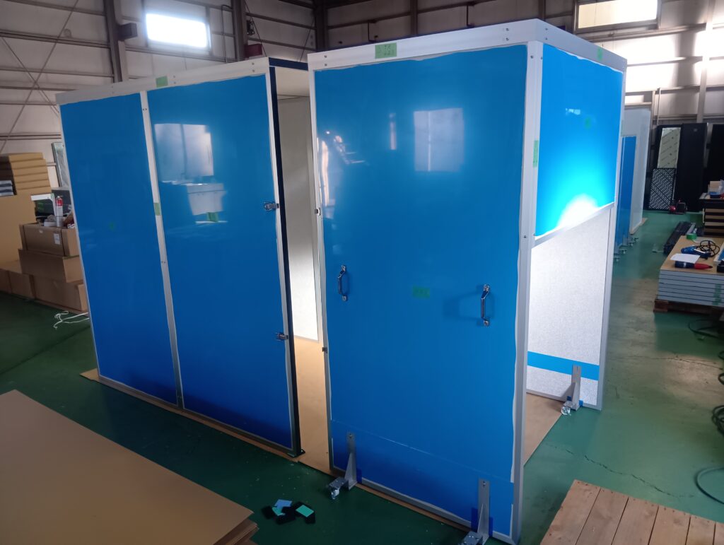 幅方向の3mのうち1m分はキャスターが底面についており、本体から分裂させて移動が可能な仕様です(2つに分解するイメージ)。固定する際はパチン錠にて簡単に合体させることができます。これにより、手軽に内部にアクセスしてメンテナンスなどが行えるようになっています。