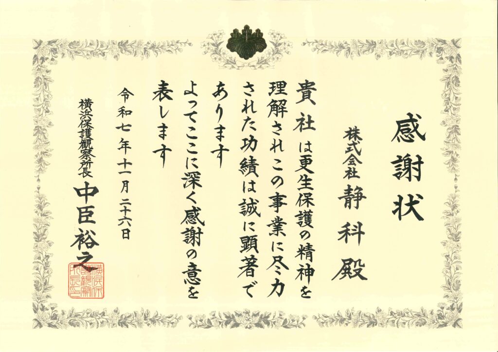 このたび、代表の保護司としての取り組みに対し、横浜保護観察所長感謝状をいただきました。