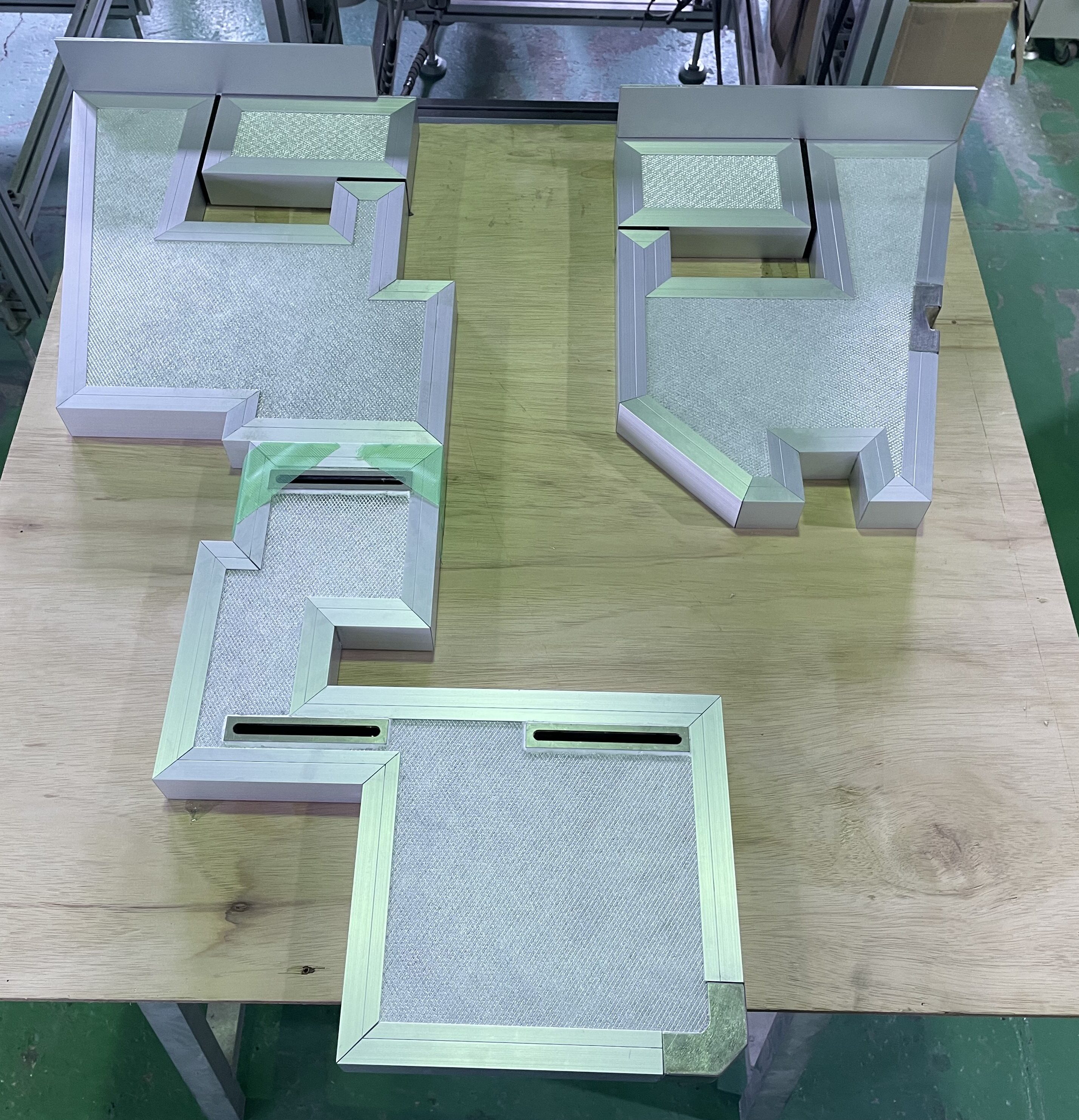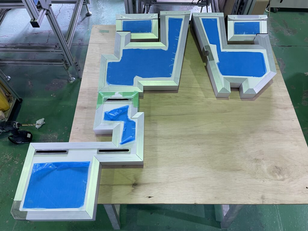 また、スライド機構を設ける箇所については、弊社標準の端面補強枠材では対応が難しかったため、希望形状に合わせた板金材を採用しました。板金材を用いることで、ジグソー等による加工と比べ寸法誤差を抑えることができ、今回はお客様のご指定によりステンレス材にて製作・取付を行っています。