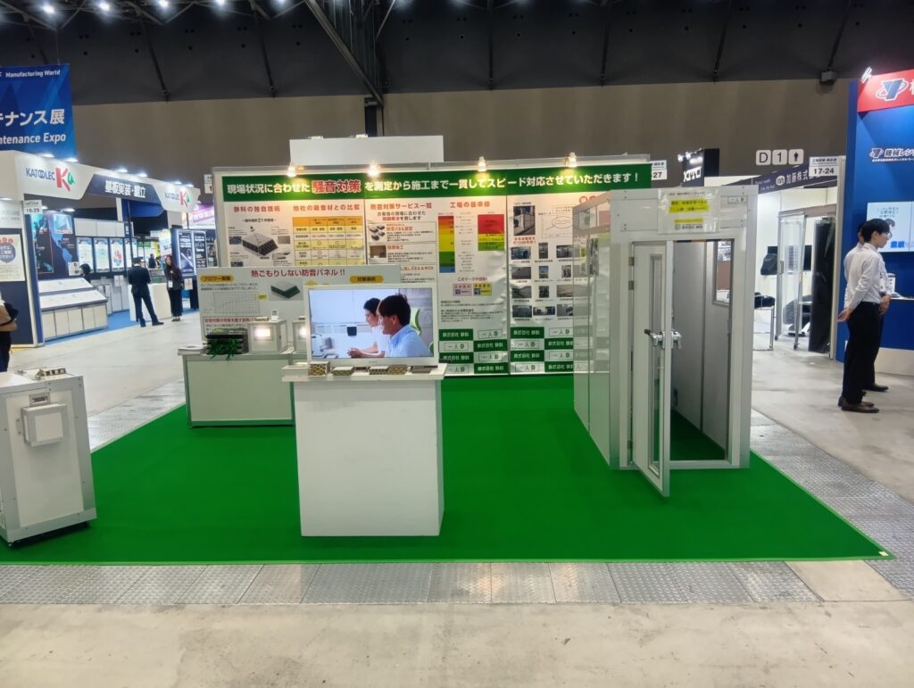 今回は、ものづくりワールド名古屋 工場設備・備品展への出展内容についてご紹介いたしました。弊社の強みは、製品を販売するだけではなく、現場状況や騒音の発生源に応じたご提案まで一貫して行える点にあります。工場設備展のような場でも、単に防音パネルの性能を説明するのではなく、発電機、モーター、コンプレッサー、加工機、試験機、大型室外機など、それぞれ異なる騒音源に対してどのような対策が適しているかを具体的にご案内できます。
