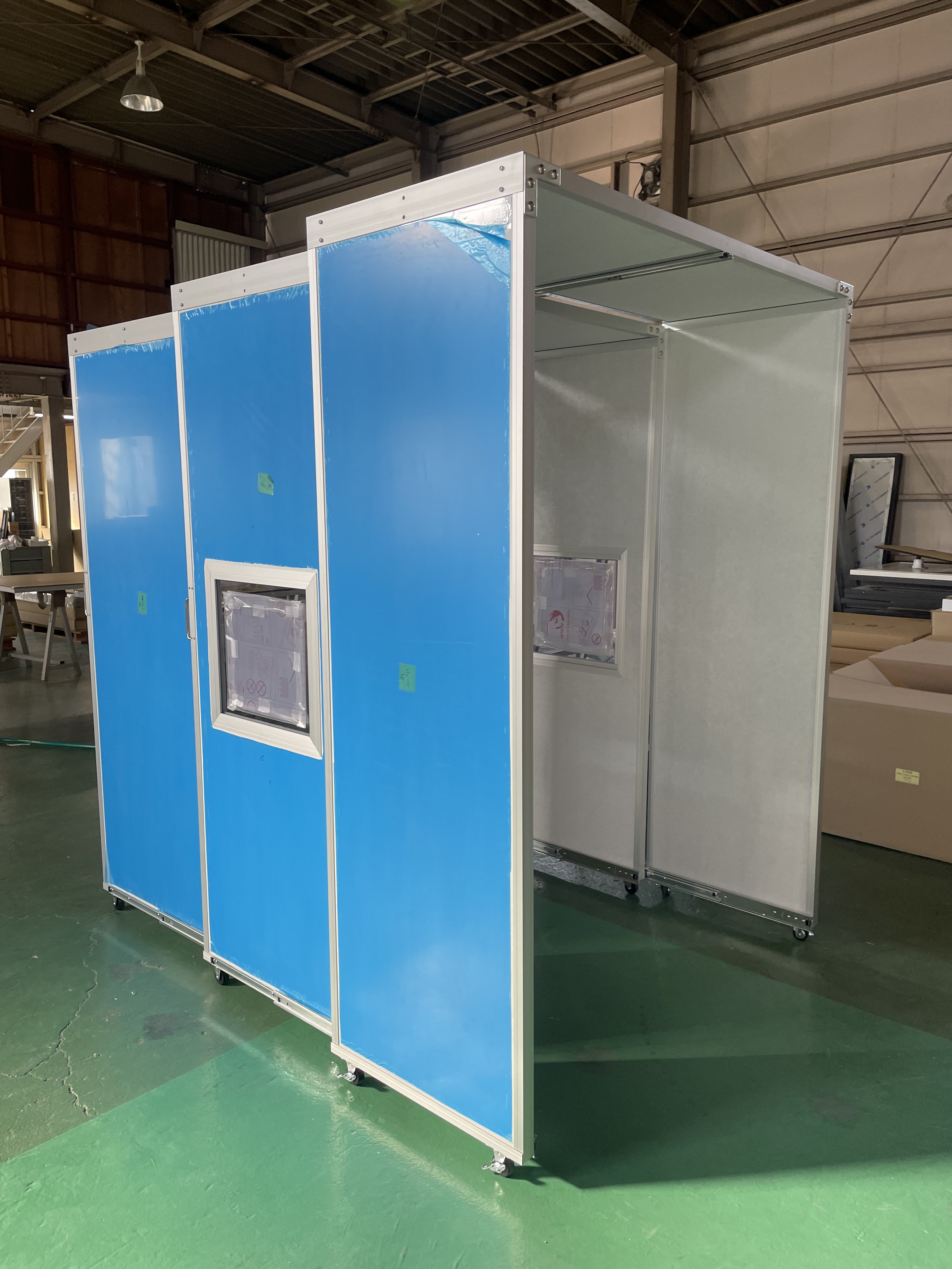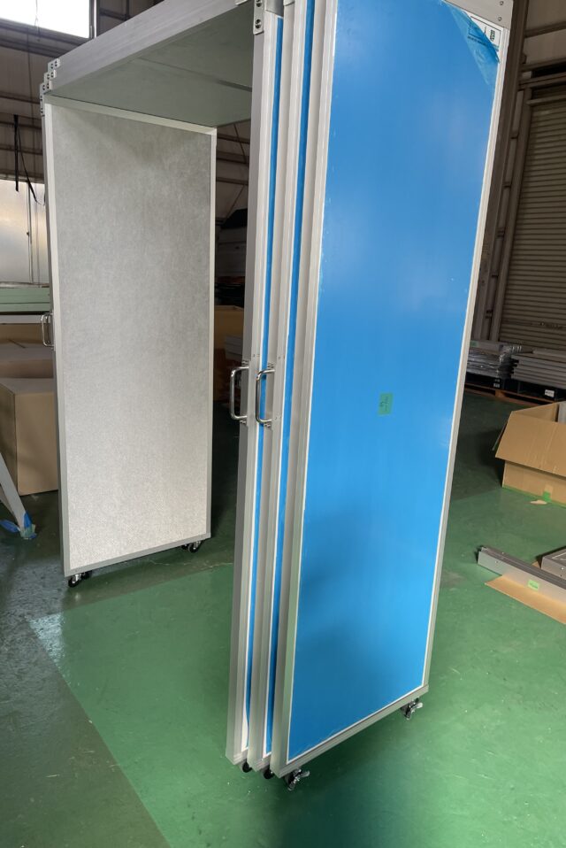 今回製作した防音パーティションは、スライドレール式の3面トンネル型構造で、
