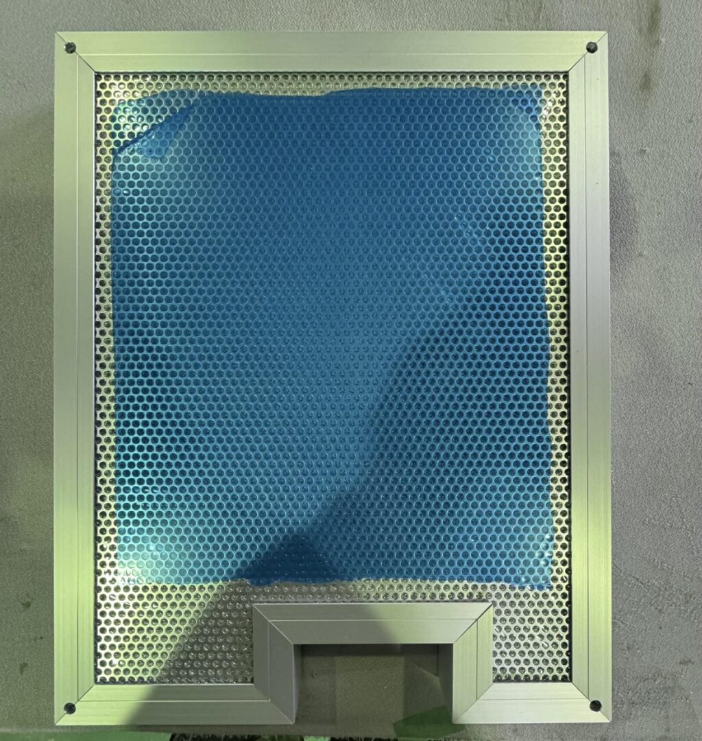 また、本案件では穴あけ加工も含まれており、取付位置や開口寸法の精度が重要となるため、加工時には特に注意を払って作業を行っております。 加工においては、図面通りの寸法精度を確保することはもちろん、穴位置や開口部の仕上がりについても細かく確認しながら進めています。わずかな誤差でも現場での組立性や性能に影響を与えるため、一枚一枚丁寧に製作を行いました。