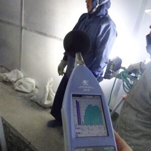 写真のように、橋梁付近に仮囲いをおこない、内部弊社吸音パネルを設置しました。通常の周囲暗騒音が60~75dbで、はつり音だけですと100db近く発生しますので非常に目立ちます。しかし、上記設置方法でほぼ暗騒音に近い数値を出すことができました。また、通常仮囲い内は反響が大きく、中で作業する従業員の耳への負担、周囲安全確保の低下が懸念されます。しかし、吸音パネルの特性を活かし、内部反響はほぼ起こっておりません。これにより、工事に関わる方々の安全・健康面にも配慮されることとなります。
