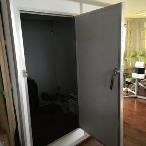 弊社のパネルで防音室を作り、同じパネルで扉をつける事も可能です。下記写真のように扉をつけ、密閉状態にする事が出来ますし、お客様のお好みの位置に、取っ手やドアノブをつける事もできます。