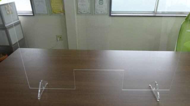 デスク用のアクリルパーテーションです。脚もついておりますので、そのまま机上に設置できます。また、透明度が高いため対面の状況も確認でき、圧迫感も少ない仕様です。