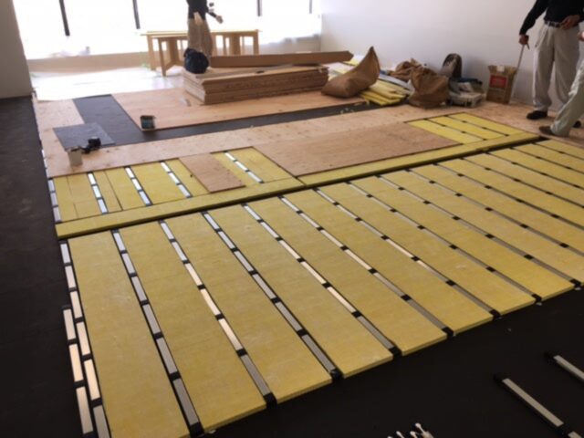 仕上げ材等を直接躯体構造に固定する形ではなく、下地と縁を切る「浮き構造」を簡単に実現し「音の伝わり=振動」を大幅に軽減することを可能にしました。従来の防音材に比べて「軽量」「低音域にも有効」「施工が簡単」といった特徴があり、床の防振対策や壁の振動防音の対策として大変有効です。マンション・戸建の上下階や、ホームシアター、楽器練習室、音楽スタジオ、ダンススタジオに採用されています。
