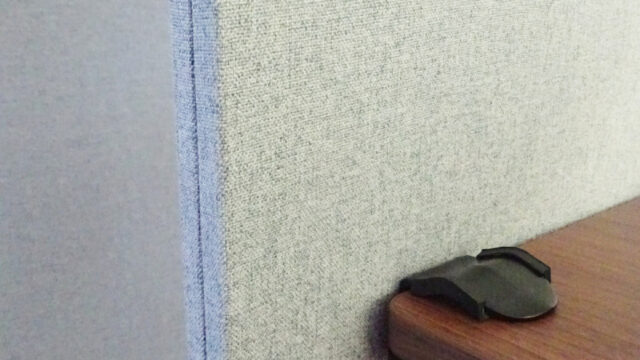 タイプKは、机側面・正面に取り付けられる吸音パネルです。机に取り付けることで自立するため、配線などで床にスペースが取れない場所で有効です。金具を絞めることで固定しますので、様々な机の厚さに対応可能です。両面が吸音仕様のため、対象机の前後左右の机にも吸音効果が得られます。